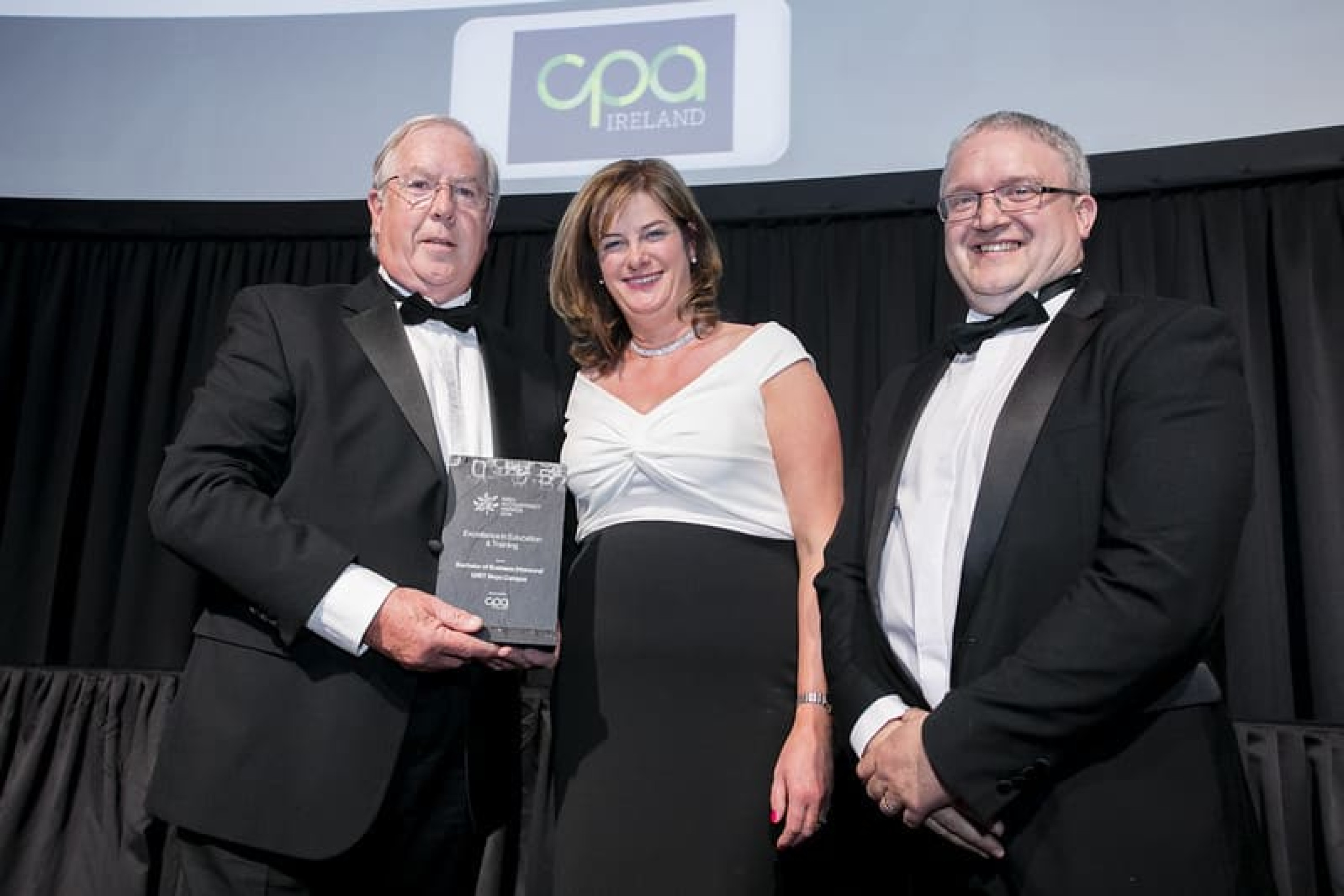 Gearóid O’Driscoll, President, CPA Ireland, presents the Excellence in Education & Training award to Caroline Clarke & Michael Gill, GMIT Mayo Campus.