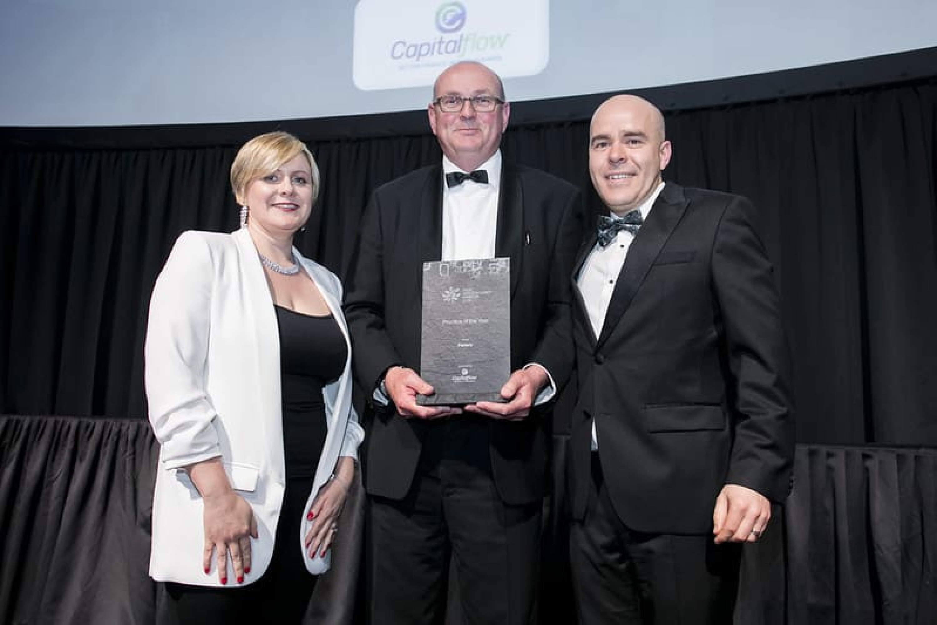 Colum Breslin, Managing Director, Capitalflow, presents the Practice of the Year award to Sinead Doherty & David O'Reilly, Fenero.