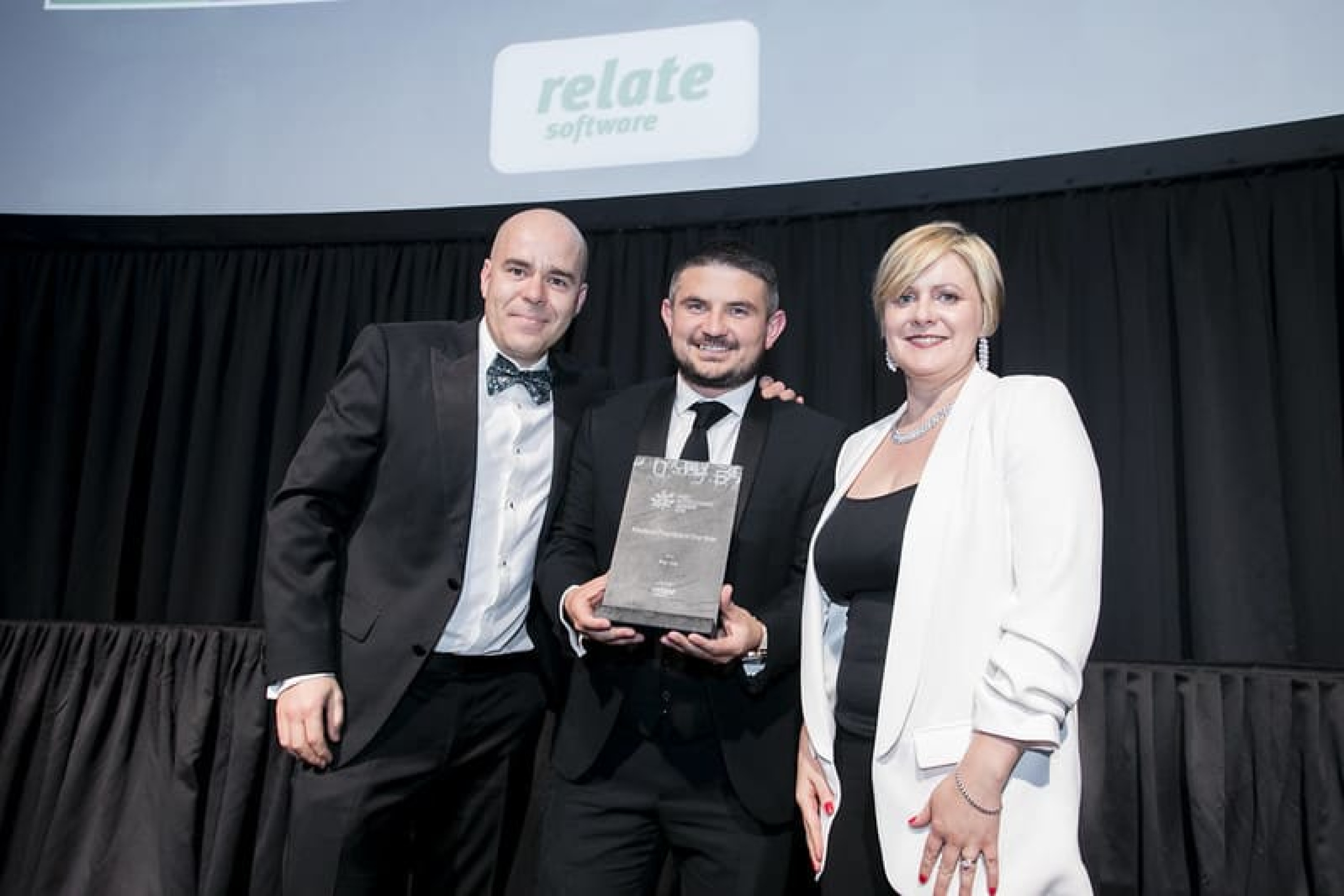 Luke Halpin, on behalf of Relate Software Group, presents the Medium Practice of the Year award to David O'Reilly & Sinead Doherty, Fenero.